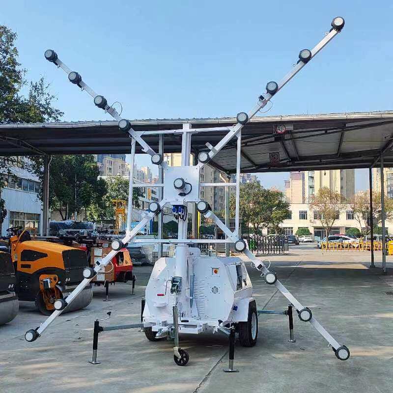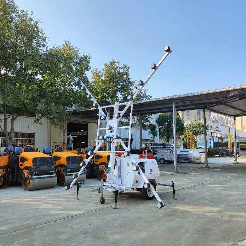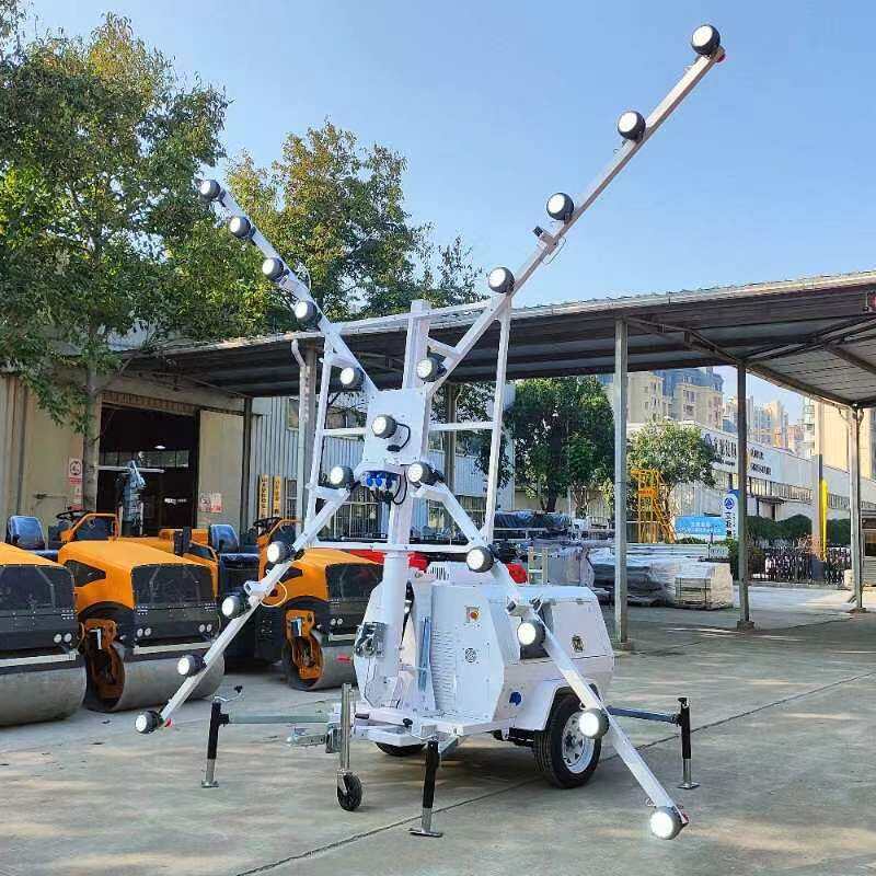 The lighting tower includes a stable base, a secure mast locking mechanism, and a robust structural design to ensure safe operation during lifting and use.