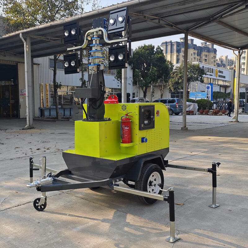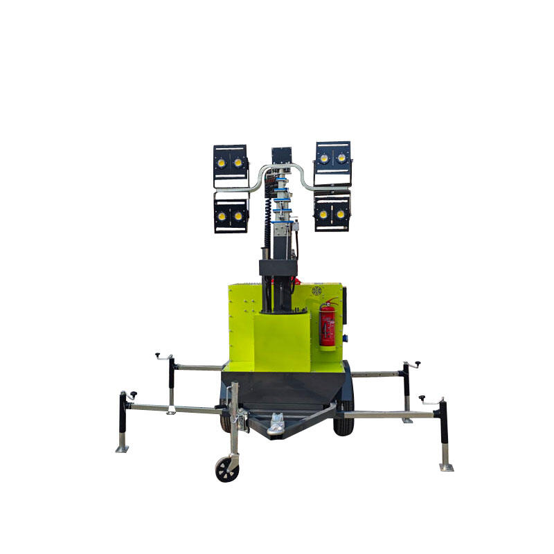 The lighting tower includes a stable base, a secure mast locking mechanism, and a robust structural design to ensure safe operation during lifting and use.